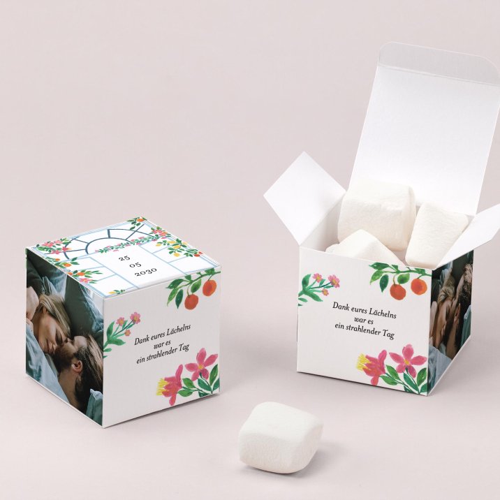 Gestalten Sie die Geschenkbox mit Ihren Namen, dem Hochzeitsdatum und ein paar Dankesworten. Gefüllt werden kann die 5,4 x 5,4 cm große Verpackung mit Süßigkeiten oder einer kleinen Aufmerksamkeit. Lassen Sie Ihrer Fantasie freien Lauf und überraschen Sie Ihre Liebsten mit Bonbons, Macarons, Pralinen oder einem kleinen Geschenk.