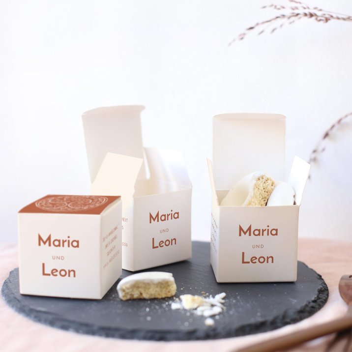 Gestalten Sie die Geschenkbox mit Ihren Namen, dem Hochzeitsdatum und ein paar Dankesworten. Gefüllt werden kann die 5,4 x 5,4 cm große Verpackung mit Süßigkeiten oder einer kleinen Aufmerksamkeit. Lassen Sie Ihrer Fantasie freien Lauf und überraschen Sie Ihre Liebsten mit Bonbons, Macarons, Pralinen oder einem kleinen Geschenk.