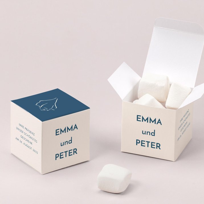 Gestalten Sie die Geschenkbox mit Ihren Namen, dem Hochzeitsdatum und ein paar Dankesworten. Gefüllt werden kann die 5,4 x 5,4 cm große Verpackung mit Süßigkeiten oder einer kleinen Aufmerksamkeit. Lassen Sie Ihrer Fantasie freien Lauf und überraschen Sie Ihre Liebsten mit Bonbons, Macarons, Pralinen oder einem kleinen Geschenk.