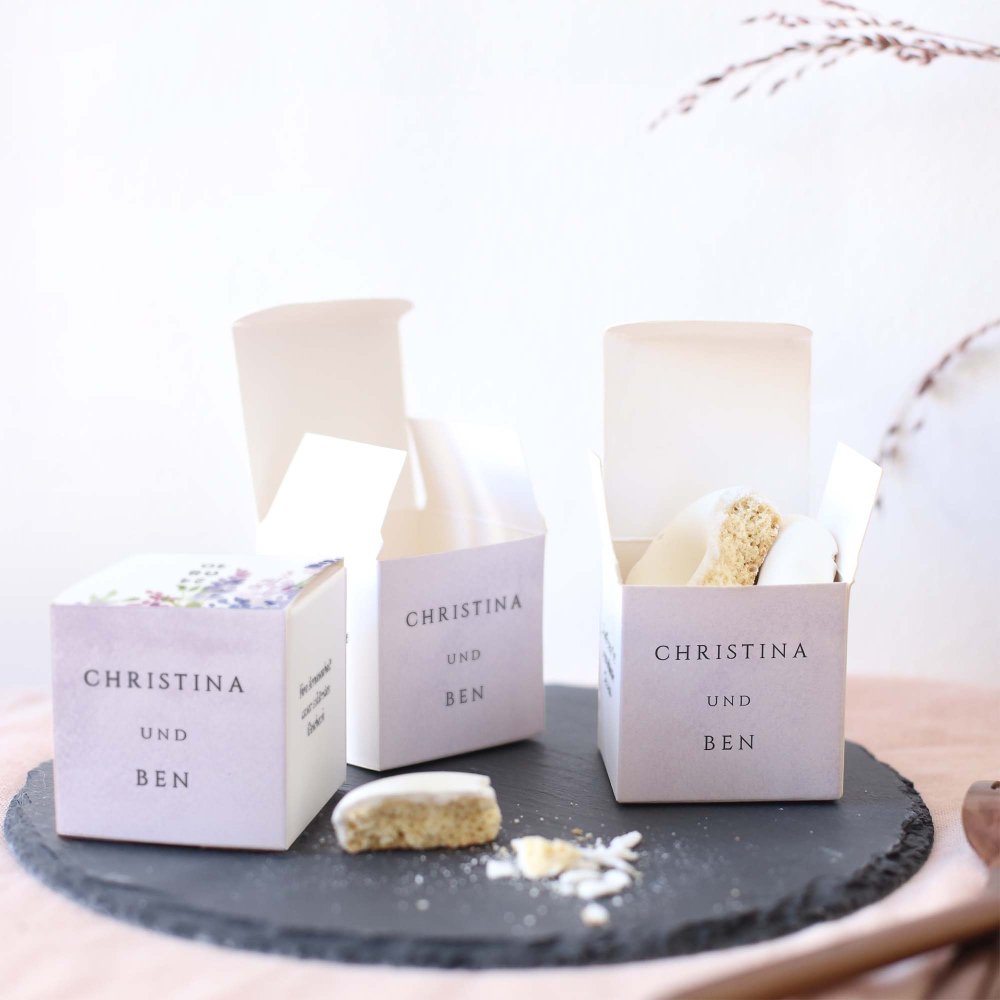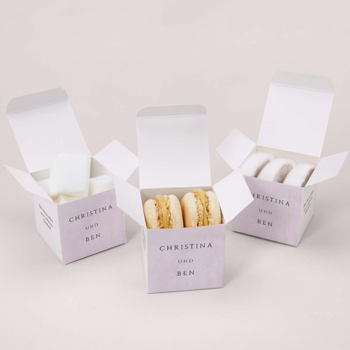 Gestalten Sie die Geschenkbox mit Ihren Namen, dem Hochzeitsdatum und ein paar Dankesworten. Gefüllt werden kann die 5,4 x 5,4 cm große Verpackung mit Süßigkeiten oder einer kleinen Aufmerksamkeit. Lassen Sie Ihrer Fantasie freien Lauf und überraschen Sie Ihre Liebsten mit Bonbons, Macarons, Pralinen oder einem kleinen Geschenk.