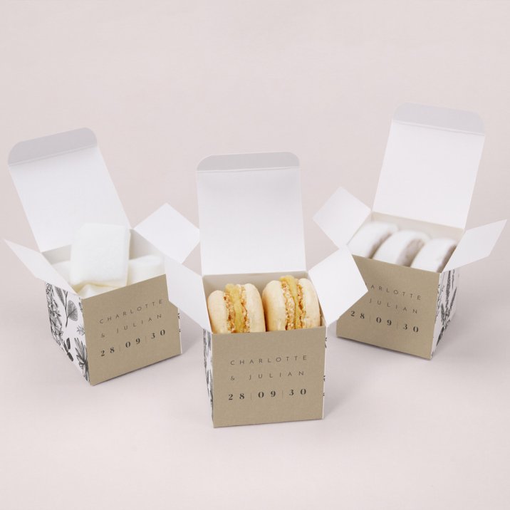 Gestalten Sie die Geschenkbox mit Ihren Namen, dem Hochzeitsdatum und ein paar Dankesworten. Gefüllt werden kann die 5,4 x 5,4 cm große Verpackung mit Süßigkeiten oder einer kleinen Aufmerksamkeit. Lassen Sie Ihrer Fantasie freien Lauf und überraschen Sie Ihre Liebsten mit Bonbons, Macarons, Pralinen oder einem kleinen Geschenk.