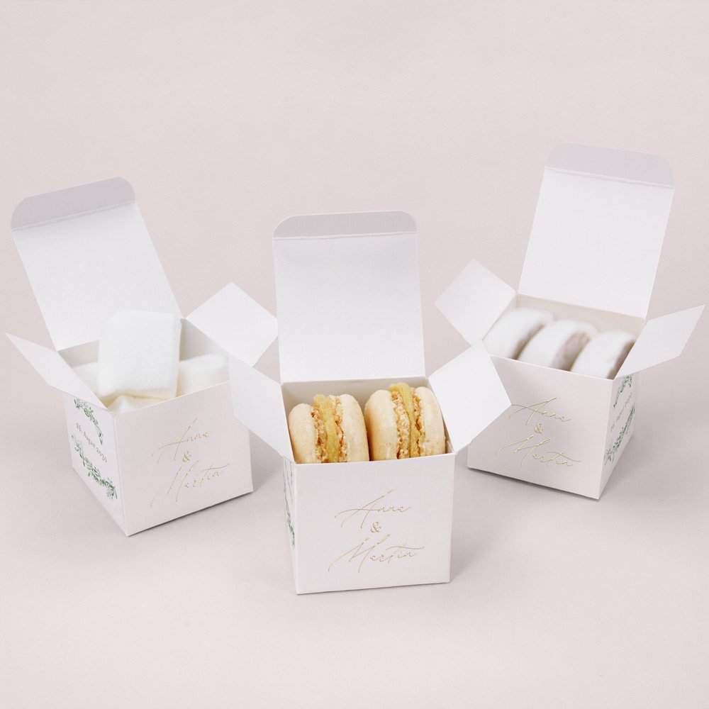 Gestalten Sie die Geschenkbox mit Ihren Namen, dem Hochzeitsdatum und ein paar Dankesworten. Gefüllt werden kann die 5,4 x 5,4 cm große Verpackung mit Süßigkeiten oder einer kleinen Aufmerksamkeit. Lassen Sie Ihrer Fantasie freien Lauf und überraschen Sie Ihre Liebsten mit Bonbons, Macarons, Pralinen oder einem kleinen Geschenk.
