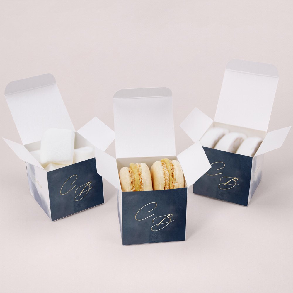Gestalten Sie die Geschenkbox mit Ihren Namen, dem Hochzeitsdatum und ein paar Dankesworten. Gefüllt werden kann die 5,4 x 5,4 cm große Verpackung mit Süßigkeiten oder einer kleinen Aufmerksamkeit. Lassen Sie Ihrer Fantasie freien Lauf und überraschen Sie Ihre Liebsten mit Bonbons, Macarons, Pralinen oder einem kleinen Geschenk.