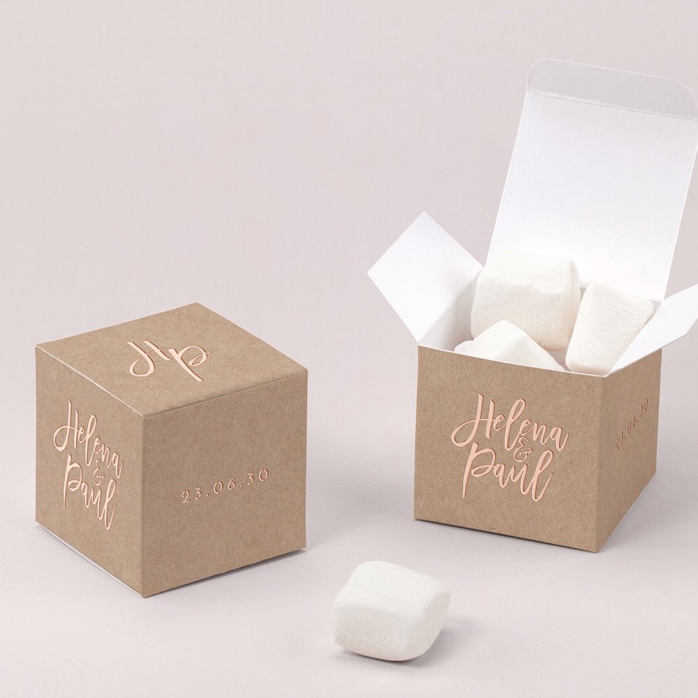 Gestalten Sie die Geschenkbox mit Ihren Namen, dem Hochzeitsdatum und ein paar Dankesworten. Gefüllt werden kann die 5,4 x 5,4 cm große Verpackung mit Süßigkeiten oder einer kleinen Aufmerksamkeit. Lassen Sie Ihrer Fantasie freien Lauf und überraschen Sie Ihre Liebsten mit Bonbons, Macarons, Pralinen oder einem kleinen Geschenk.