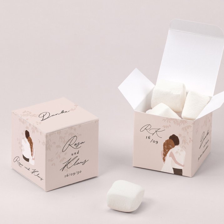 Gestalten Sie die Geschenkbox mit Ihren Namen, dem Hochzeitsdatum und ein paar Dankesworten. Gefüllt werden kann die 5,4 x 5,4 cm große Verpackung mit Süßigkeiten oder einer kleinen Aufmerksamkeit. Lassen Sie Ihrer Fantasie freien Lauf und überraschen Sie Ihre Liebsten mit Bonbons, Macarons, Pralinen oder einem kleinen Geschenk.