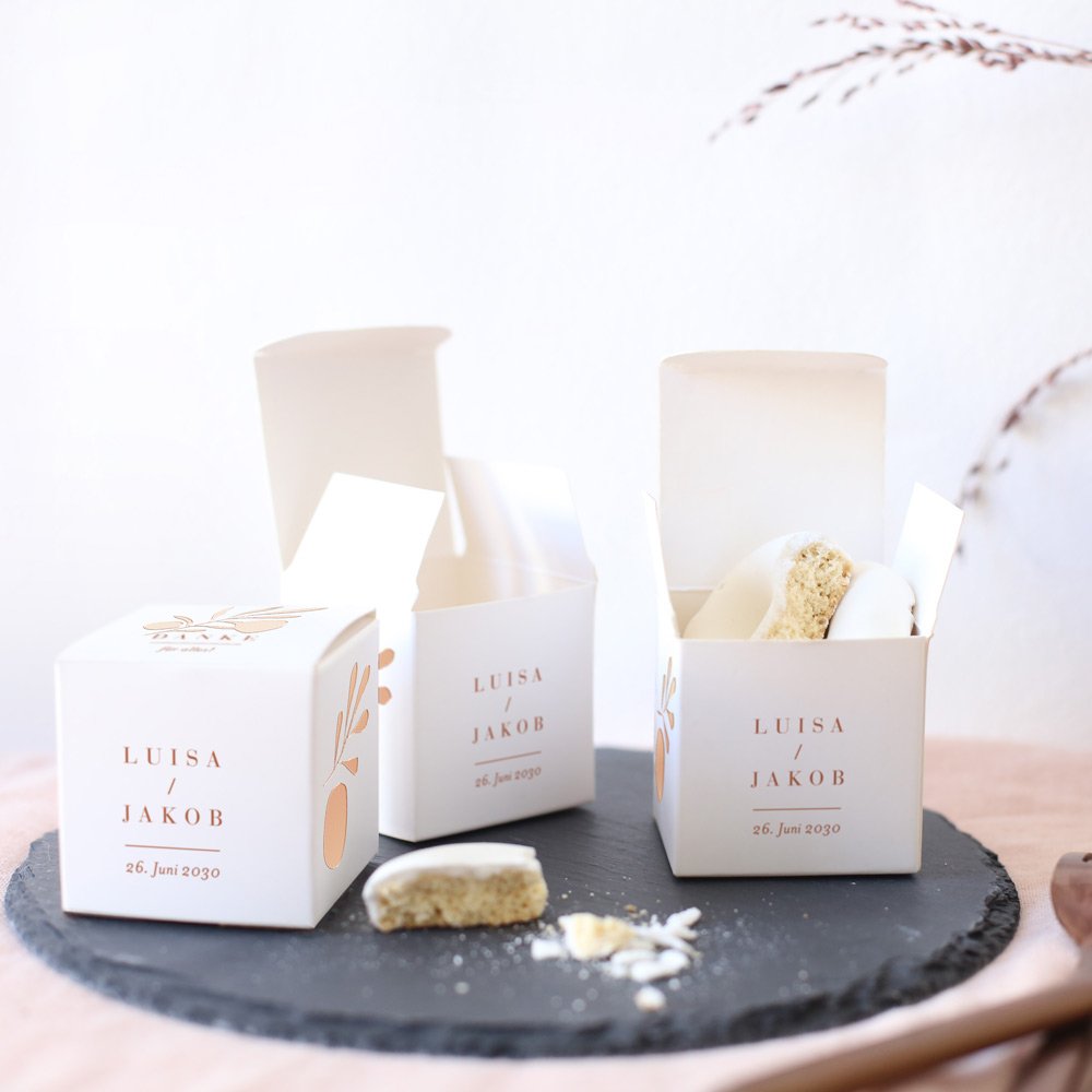 Unsere personalisierbare Geschenkbox ist die perfekte Verpackung für ein kleines Gastgeschenk, das Ihre Hochzeitsgäste nach den Feierlichkeiten sicherlich gerne als Erinnerung mit nach Hause nehmen.