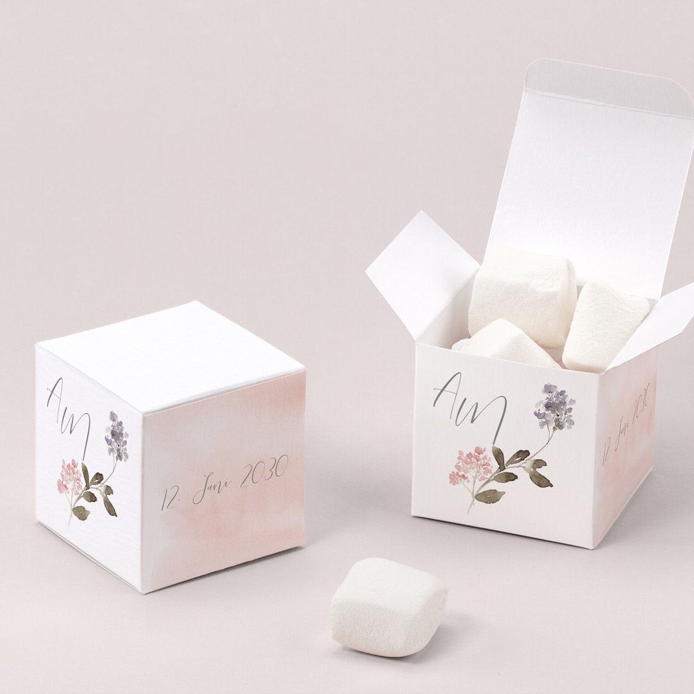 Gestalten Sie die Geschenkbox mit Ihren Namen, dem Hochzeitsdatum und ein paar Dankesworten. Gefüllt werden kann die 5,4 x 5,4 cm große Verpackung mit Süßigkeiten oder einer kleinen Aufmerksamkeit. Lassen Sie Ihrer Fantasie freien Lauf und überraschen Sie Ihre Liebsten mit Bonbons, Macarons, Pralinen oder einem kleinen Geschenk.