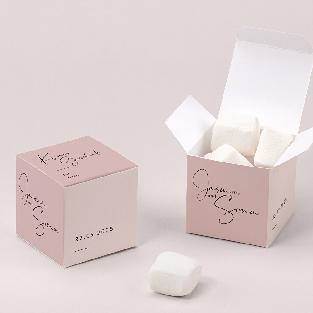 Gestalten Sie die Geschenkbox mit Ihren Namen, dem Hochzeitsdatum und ein paar Dankesworten. Gefüllt werden kann die 5,4 x 5,4 cm große Verpackung mit Süßigkeiten oder einer kleinen Aufmerksamkeit. Lassen Sie Ihrer Fantasie freien Lauf und überraschen Sie Ihre Liebsten mit Bonbons, Macarons, Pralinen oder einem kleinen Geschenk.