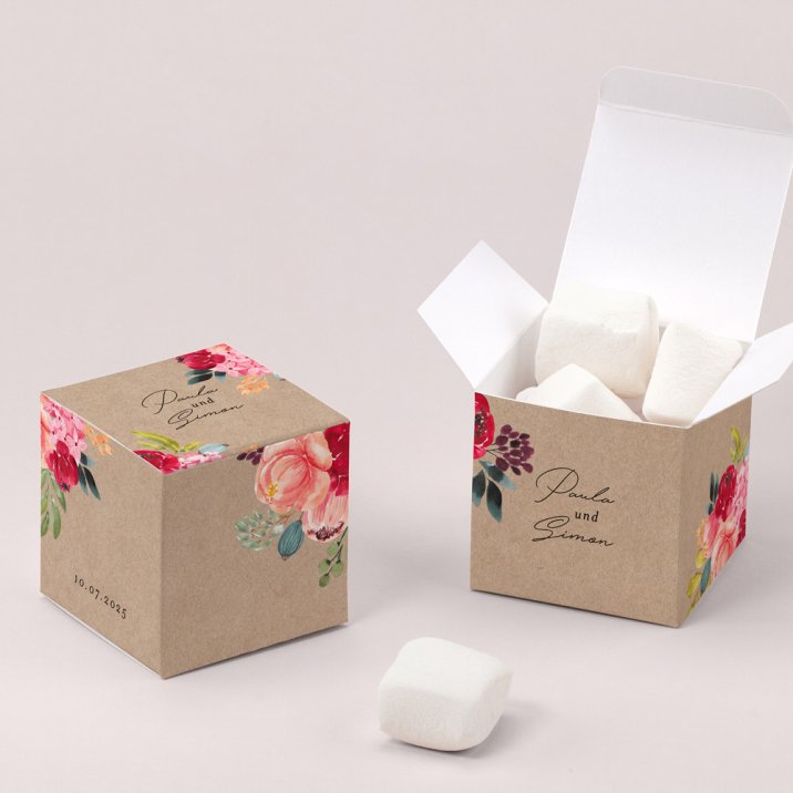 Gestalten Sie die Geschenkbox mit Ihren Namen, dem Hochzeitsdatum und ein paar Dankesworten. Gefüllt werden kann die 5,4 x 5,4 cm große Verpackung mit Süßigkeiten oder einer kleinen Aufmerksamkeit. Lassen Sie Ihrer Fantasie freien Lauf und überraschen Sie Ihre Liebsten mit Bonbons, Macarons, Pralinen oder einem kleinen Geschenk.