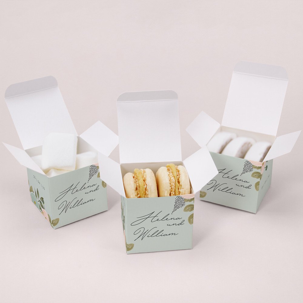 Gestalten Sie die Geschenkbox mit Ihren Namen, dem Hochzeitsdatum und ein paar Dankesworten. Gefüllt werden kann die 5,4 x 5,4 cm große Verpackung mit Süßigkeiten oder einer kleinen Aufmerksamkeit. Lassen Sie Ihrer Fantasie freien Lauf und überraschen Sie Ihre Liebsten mit Bonbons, Macarons, Pralinen oder einem kleinen Geschenk.