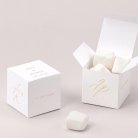 Gestalten Sie die Geschenkbox mit Ihren Namen, dem Hochzeitsdatum und ein paar Dankesworten. Gefüllt werden kann die 5,4 x 5,4 cm große Verpackung mit Süßigkeiten oder einer kleinen Aufmerksamkeit. Lassen Sie Ihrer Fantasie freien Lauf und überraschen Sie Ihre Liebsten mit Bonbons, Macarons, Pralinen oder einem kleinen Geschenk.