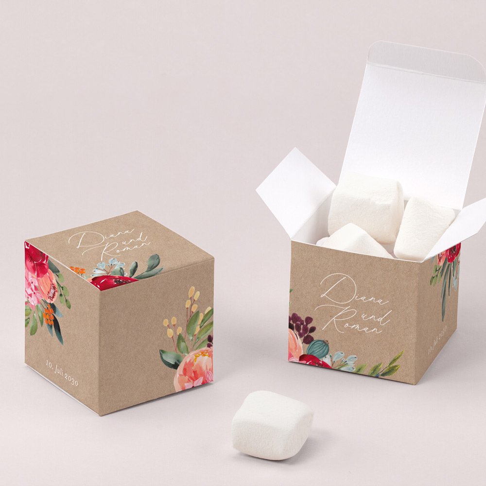 Gestalten Sie die Geschenkbox mit Ihren Namen, dem Hochzeitsdatum und ein paar Dankesworten. Gefüllt werden kann die 5,4 x 5,4 cm große Verpackung mit Süßigkeiten oder einer kleinen Aufmerksamkeit. Lassen Sie Ihrer Fantasie freien Lauf und überraschen Sie Ihre Liebsten mit Bonbons, Macarons, Pralinen oder einem kleinen Geschenk.