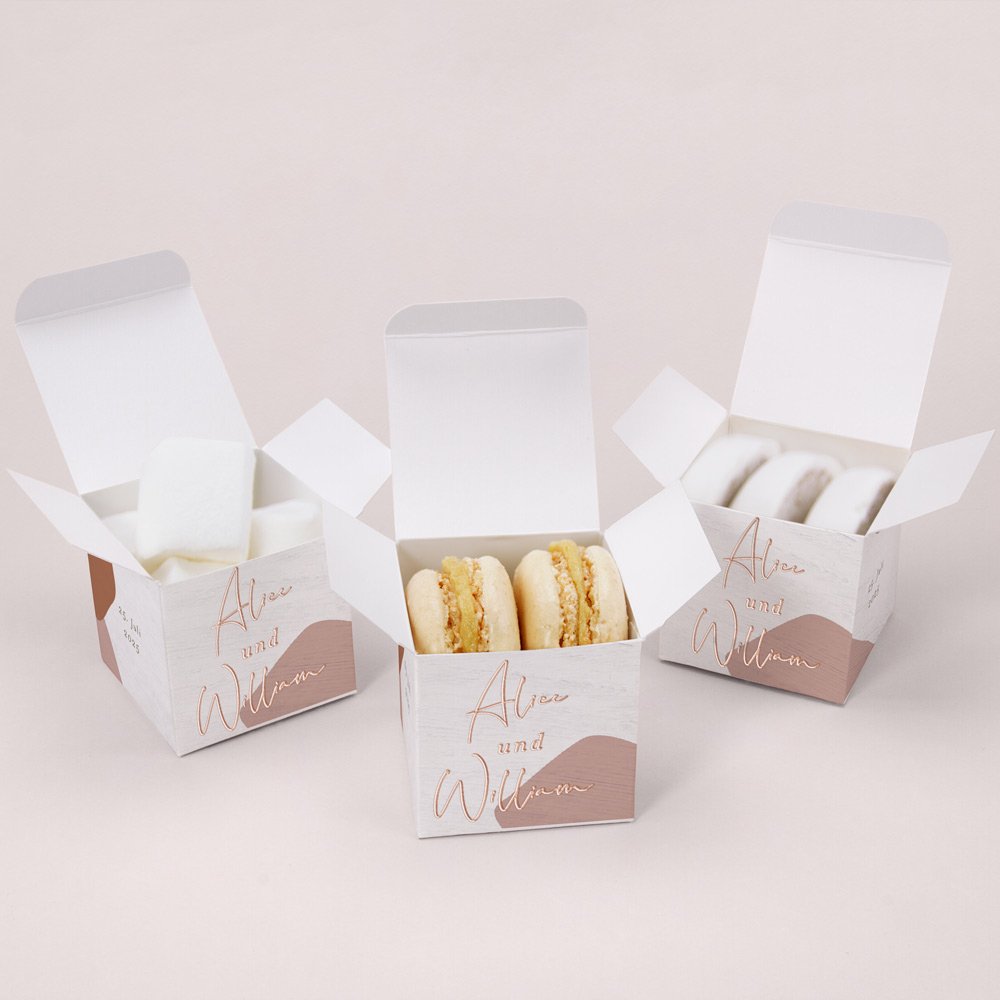 Füllen Sie die Geschenkbox mit Hochzeitsmandeln, Macaros oder Bonbons als kleine Aufmerksamkeit für Ihre Gäste.