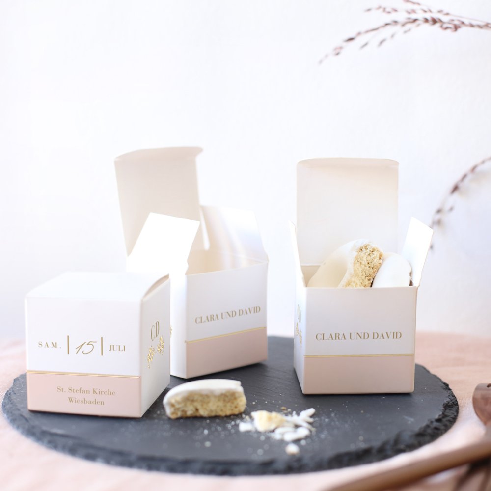 Gestalten Sie die Geschenkbox mit Ihren Namen, dem Hochzeitsdatum und ein paar Dankesworten. Gefüllt werden kann die 5,4 x 5,4 cm große Verpackung mit Süßigkeiten oder einer kleinen Aufmerksamkeit. Lassen Sie Ihrer Fantasie freien Lauf und überraschen Sie Ihre Liebsten mit Bonbons, Macarons, Pralinen oder einem kleinen Geschenk.