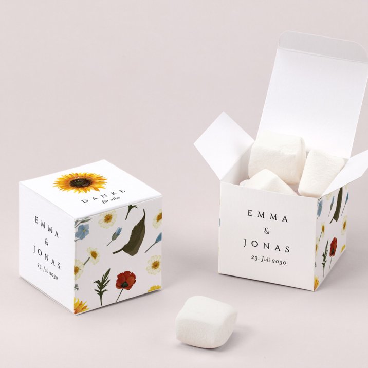 Gestalten Sie die Geschenkbox mit Ihren Namen, dem Hochzeitsdatum und ein paar Dankesworten. Gefüllt werden kann die 5,4 x 5,4 cm große Verpackung mit Süßigkeiten oder einer kleinen Aufmerksamkeit. Lassen Sie Ihrer Fantasie freien Lauf und überraschen Sie Ihre Liebsten mit Bonbons, Macarons, Pralinen oder einem kleinen Geschenk.