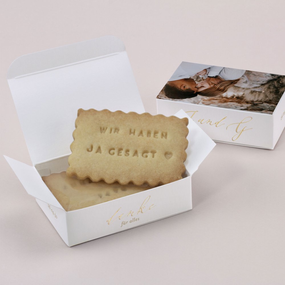 Überraschen Sie Ihre Hochzeitsgäste mit ein paar selbst gebackenen Keksen in einer schönen Keksbox! Personalisieren Sie die Schachtel mit einer kleinen Nachricht, Ihren Namen oder einem Foto und dem Datum Ihrer Hochzeit.