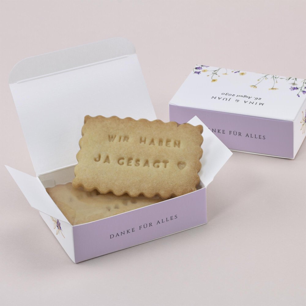 Überraschen Sie Ihre Hochzeitsgäste mit ein paar selbst gebackenen Keksen in einer schönen Keksbox! Personalisieren Sie die Schachtel mit einer kleinen Nachricht, Ihren Namen oder einem Foto und dem Datum Ihrer Hochzeit.