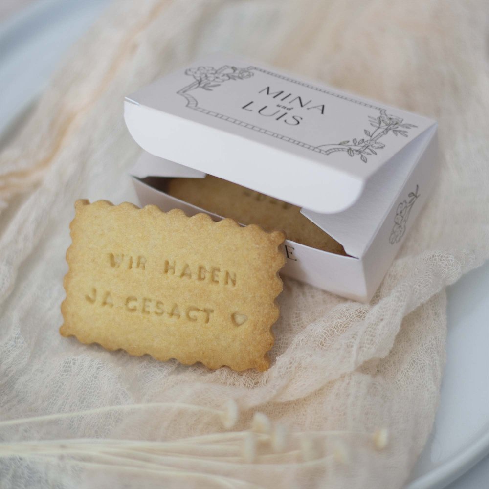 Überraschen Sie Ihre Hochzeitsgäste mit ein paar selbst gebackenen Keksen in einer schönen Keksbox! Personalisieren Sie die Schachtel mit einer kleinen Nachricht, Ihren Namen oder einem Foto und dem Datum Ihrer Hochzeit.