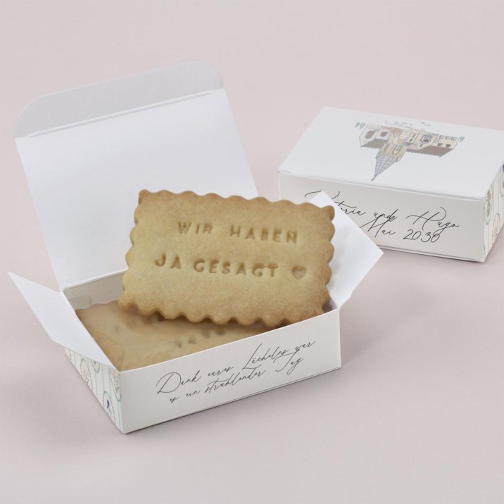 Überraschen Sie Ihre Hochzeitsgäste mit ein paar selbst gebackenen Keksen in einer schönen Keksbox! Personalisieren Sie die Schachtel mit einer kleinen Nachricht, Ihren Namen oder einem Foto und dem Datum Ihrer Hochzeit.