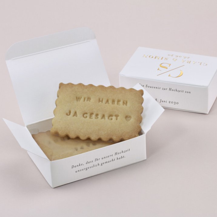 Überraschen Sie Ihre Hochzeitsgäste mit ein paar selbst gebackenen Keksen in einer schönen Keksbox! Personalisieren Sie die Schachtel mit einer kleinen Nachricht, Ihren Namen oder einem Foto und dem Datum Ihrer Hochzeit.