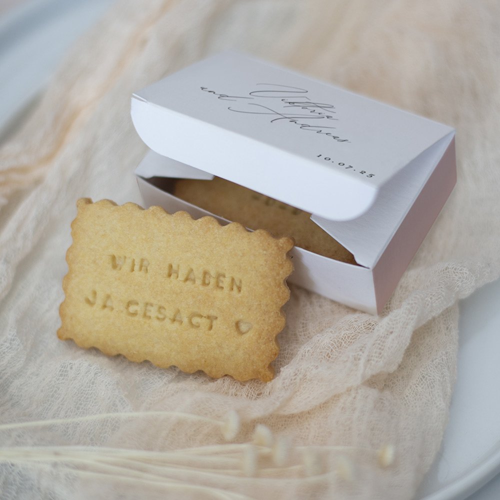Überraschen Sie Ihre Hochzeitsgäste mit ein paar selbst gebackenen Keksen in einer schönen Keksbox! Personalisieren Sie die Schachtel mit einer kleinen Nachricht, Ihren Namen oder einem Foto und dem Datum Ihrer Hochzeit.
