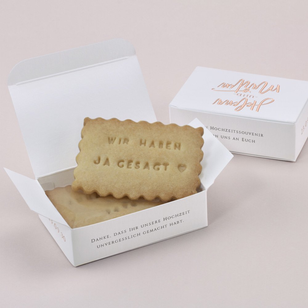 Überraschen Sie Ihre Hochzeitsgäste mit ein paar selbst gebackenen Keksen in einer schönen Keksbox! Personalisieren Sie die Schachtel mit einer kleinen Nachricht, Ihren Namen oder einem Foto und dem Datum Ihrer Hochzeit.