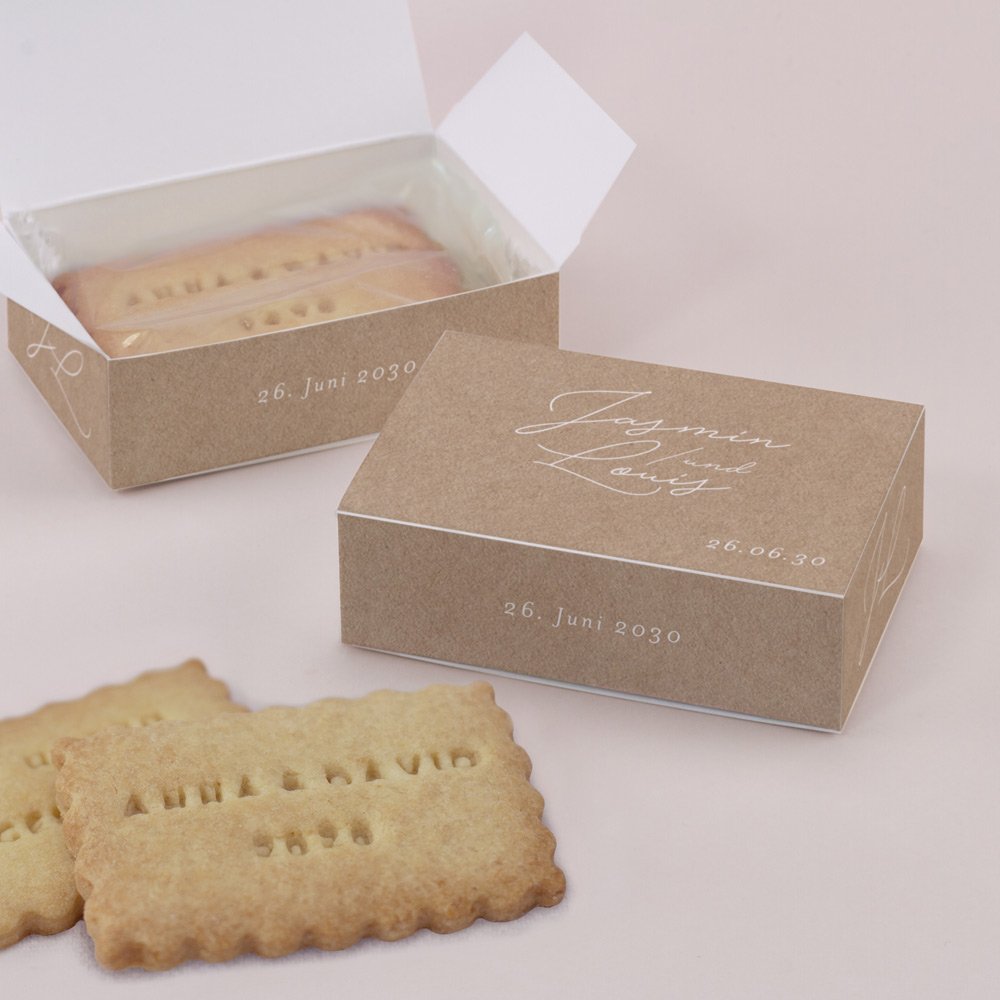 Überraschen Sie Ihre Hochzeitsgäste mit ein paar selbst gebackenen Keksen in einer schönen Keksbox! Personalisieren Sie die Schachtel mit einer kleinen Nachricht, Ihren Namen oder einem Foto und dem Datum Ihrer Hochzeit.