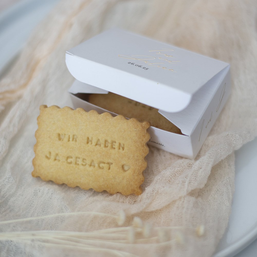 Überraschen Sie Ihre Hochzeitsgäste mit ein paar selbst gebackenen Keksen in einer schönen Keksbox! Personalisieren Sie die Schachtel mit einer kleinen Nachricht, Ihren Namen oder einem Foto und dem Datum Ihrer Hochzeit.