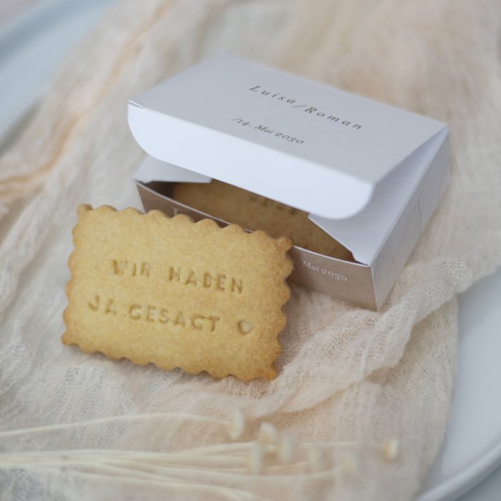 Überraschen Sie Ihre Hochzeitsgäste mit ein paar selbst gebackenen Keksen in einer schönen Keksbox! Personalisieren Sie die Schachtel mit einer kleinen Nachricht, Ihren Namen oder einem Foto und dem Datum Ihrer Hochzeit.