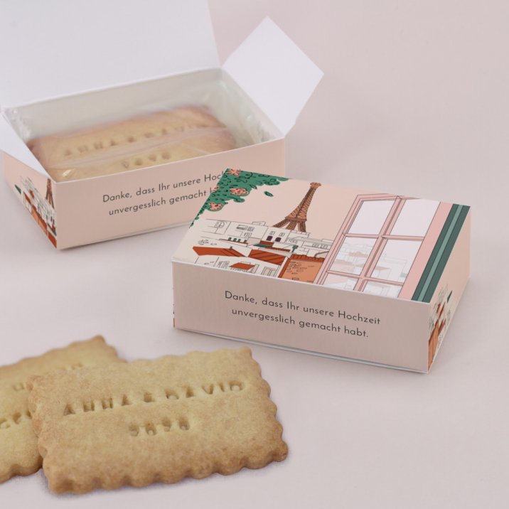 Überraschen Sie Ihre Hochzeitsgäste mit ein paar selbst gebackenen Keksen in einer schönen Keksbox! Personalisieren Sie die Schachtel mit einer kleinen Nachricht, Ihren Namen oder einem Foto und dem Datum Ihrer Hochzeit.