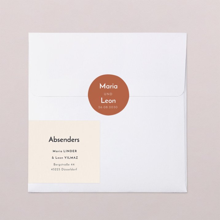 Gestalten Sie die Adressaufkleber mit Ihrer Adresse und bekleben Sie Ihre Briefumschläge, um Ihre Hochzeitspost zu dekorieren. Die Absenderadresse wird auf die rechte Seite des Aufklebers gedruckt (dieser Teil wird auf die Rückseite des Briefumschlags geklebt). Die linke Seite bleibt unbedruckt. Beschriften Sie diesen Teil per Hand mit der Empfängeradresse und verleihen Sie Ihrer Papeterie so eine ganz persönliche Note.