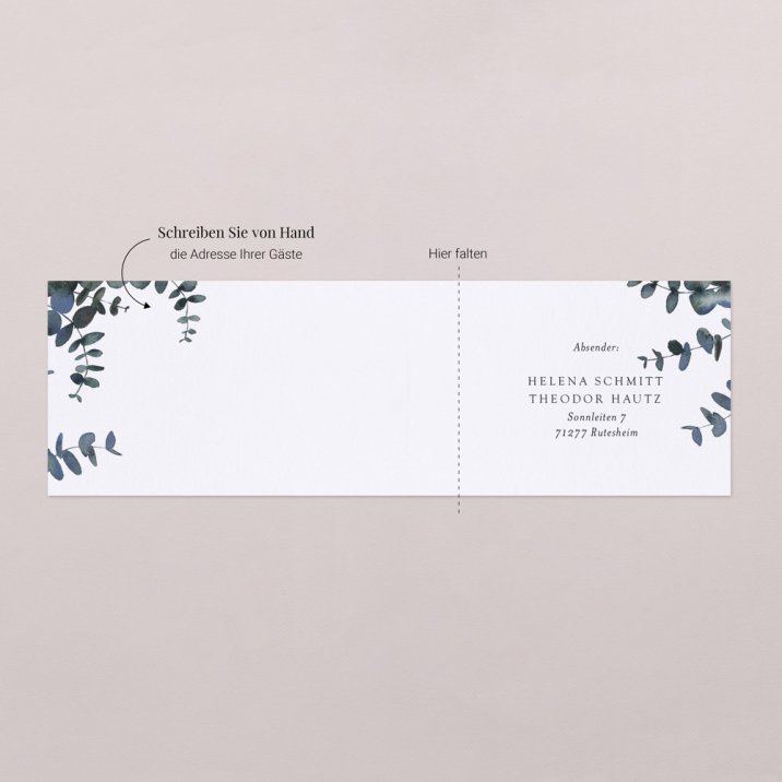 Die Hochzeitseinladung Aquaverde mit ihrer minimalistischen Aquarellillustration von Eukalyptus wird alle Brautpaare ansprechen, die nach schlichter Papeterie für ihren großen Tag suchen.