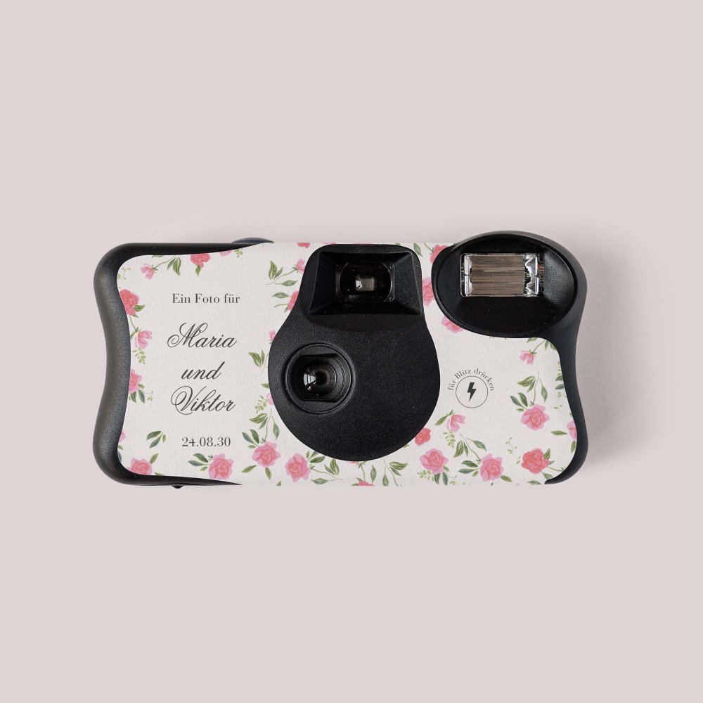 Versehen Sie die Einwegkamera für Ihre Hochzeit mit einem selbstklebenden, individuell gestaltbaren Etikett, das perfekt zum Thema Ihres großen Tages passt.