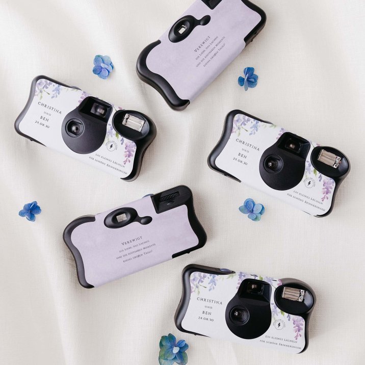 Versehen Sie die Einwegkamera für Ihre Hochzeit mit einem selbstklebenden, individuell gestaltbaren Etikett, das perfekt zum Thema Ihres großen Tages passt.