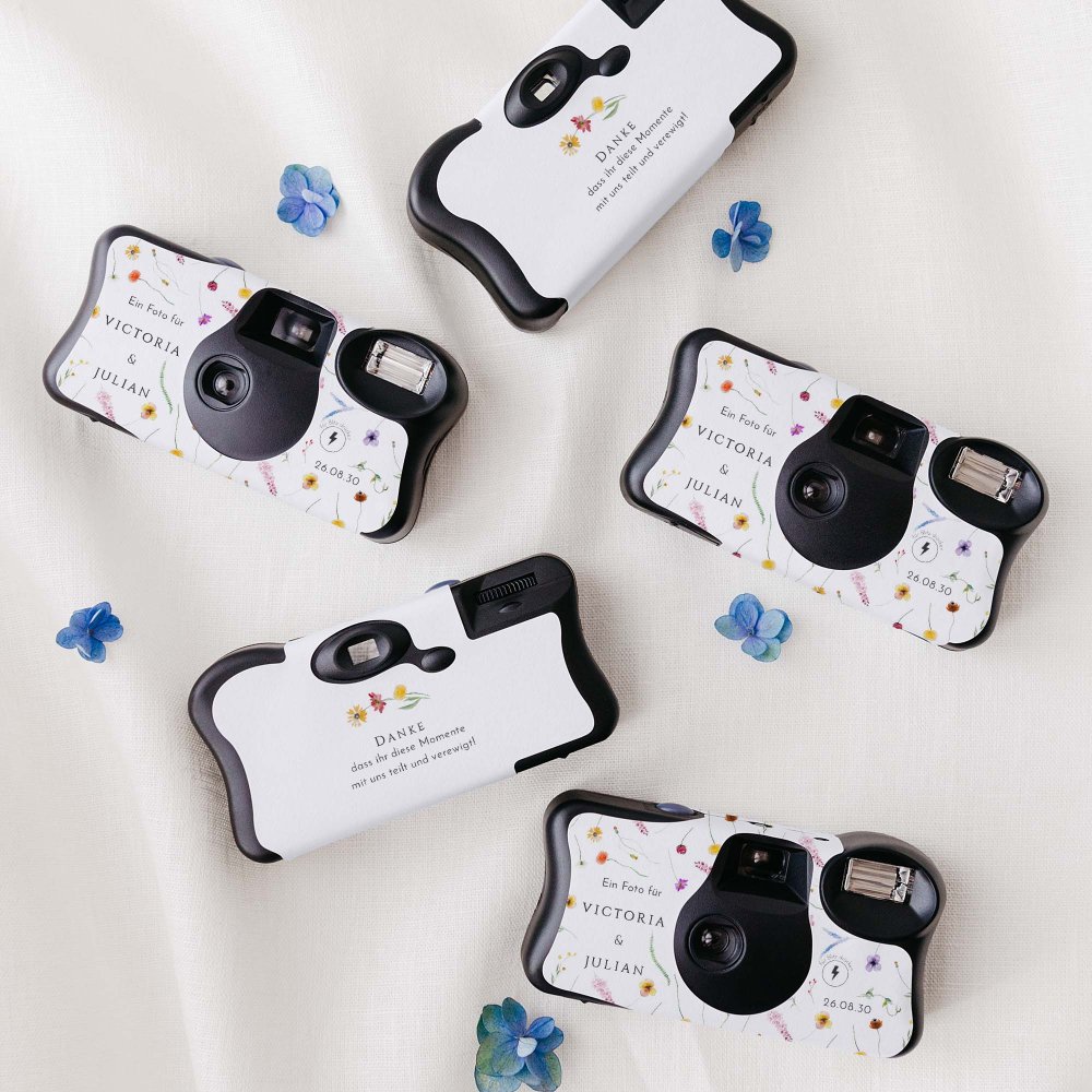 Versehen Sie die Einwegkamera für Ihre Hochzeit mit einem selbstklebenden, individuell gestaltbaren Etikett, das perfekt zum Thema Ihres großen Tages passt.