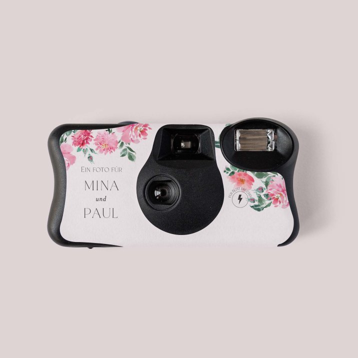 Versehen Sie die Einwegkamera für Ihre Hochzeit mit einem selbstklebenden, individuell gestaltbaren Etikett, das perfekt zum Thema Ihres großen Tages passt.