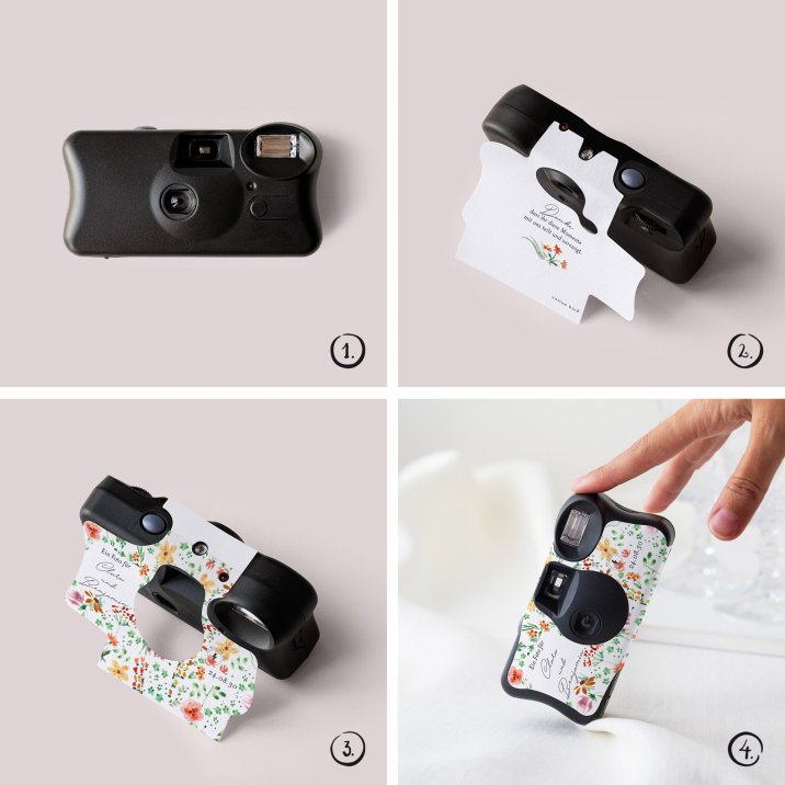 Versehen Sie die Einwegkamera für Ihre Hochzeit mit einem selbstklebenden, individuell gestaltbaren Etikett, das perfekt zum Thema Ihres großen Tages passt.