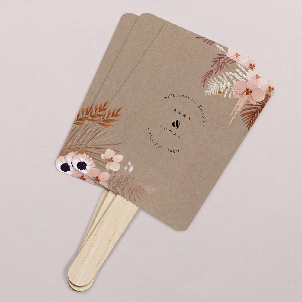 Gestalten Sie die Hochzeitsfächer mit dem Programmablauf Ihrer Feier, um Ihre Gäste auf dem Laufenden zu halten. Der Programmfächer informiert Ihre Gäste über die einzelnen Programmpunkte und sorgt für einen reibungslosen Ablauf Ihrer Hochzeitsfeier. Zudem können sich Ihre Gäste an heißen Tagen mit dem Fächer etwas frische Luft zufächeln.