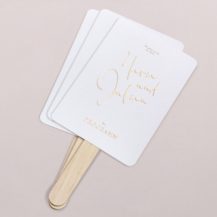 Gestalten Sie die Hochzeitsfächer mit dem Programmablauf Ihrer Feier, um Ihre Gäste auf dem Laufenden zu halten. Der Programmfächer informiert Ihre Gäste über die einzelnen Programmpunkte und sorgt für einen reibungslosen Ablauf Ihrer Hochzeitsfeier. Zudem können sich Ihre Gäste an heißen Tagen mit dem Fächer etwas frische Luft zufächeln.