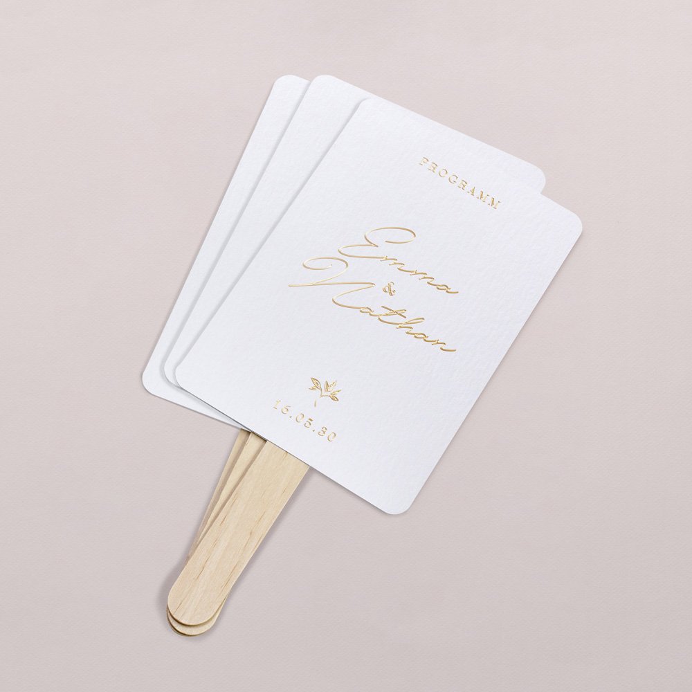 Gestalten Sie die Hochzeitsfächer mit dem Programmablauf Ihrer Feier, um Ihre Gäste auf dem Laufenden zu halten. Der Programmfächer informiert Ihre Gäste über die einzelnen Programmpunkte und sorgt für einen reibungslosen Ablauf Ihrer Hochzeitsfeier. Zudem können sich Ihre Gäste an heißen Tagen mit dem Fächer etwas frische Luft zufächeln.