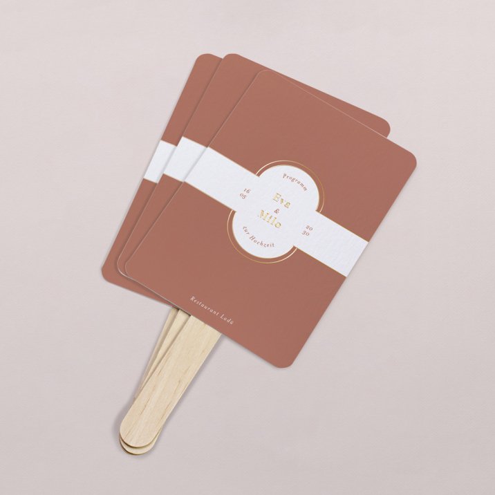 Gestalten Sie die Hochzeitsfächer mit dem Programmablauf Ihrer Feier, um Ihre Gäste auf dem Laufenden zu halten. Der Programmfächer informiert Ihre Gäste über die einzelnen Programmpunkte und sorgt für einen reibungslosen Ablauf Ihrer Hochzeitsfeier. Zudem können sich Ihre Gäste an heißen Tagen mit dem Fächer etwas frische Luft zufächeln.
