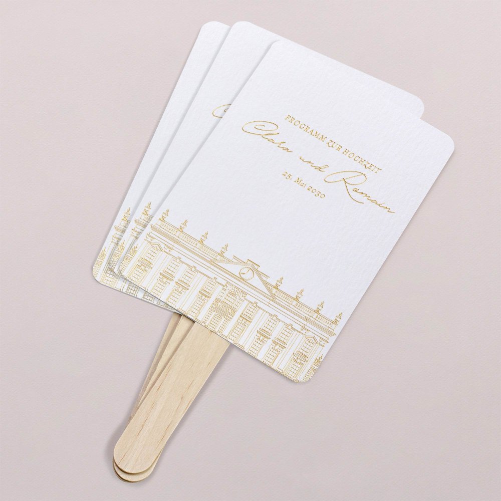 Gestalten Sie die Hochzeitsfächer mit dem Programmablauf Ihrer Feier, um Ihre Gäste auf dem Laufenden zu halten. Der Programmfächer informiert Ihre Gäste über die einzelnen Programmpunkte und sorgt für einen reibungslosen Ablauf Ihrer Hochzeitsfeier. Zudem können sich Ihre Gäste an heißen Tagen mit dem Fächer etwas frische Luft zufächeln.