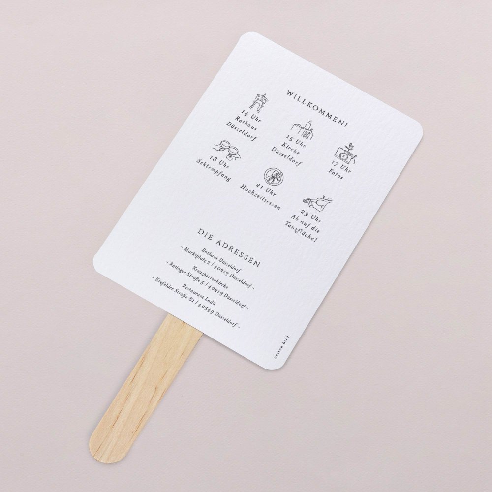 Gestalten Sie die Hochzeitsfächer mit dem Programmablauf Ihrer Feier, um Ihre Gäste auf dem Laufenden zu halten. Der Programmfächer informiert Ihre Gäste über die einzelnen Programmpunkte und sorgt für einen reibungslosen Ablauf Ihrer Hochzeitsfeier. Zudem können sich Ihre Gäste an heißen Tagen mit dem Fächer etwas frische Luft zufächeln.