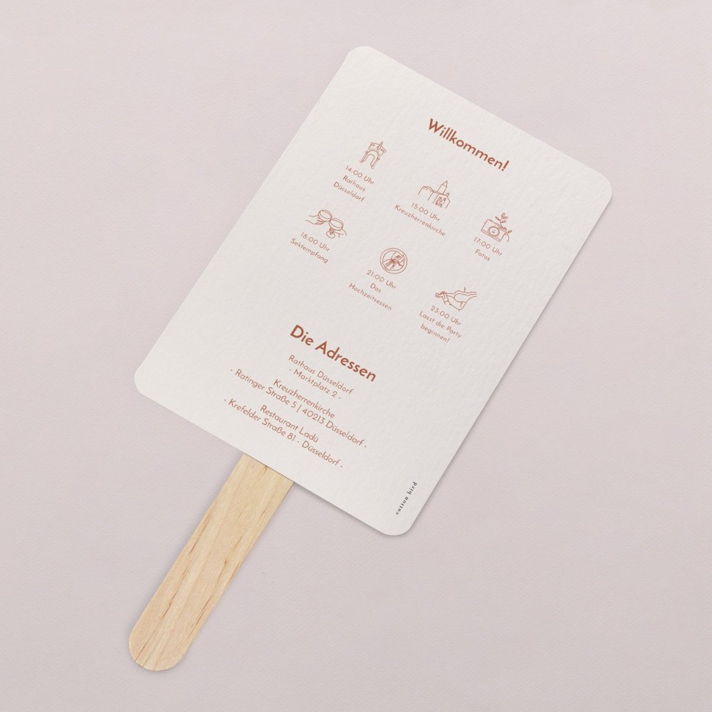 Gestalten Sie die Hochzeitsfächer mit dem Programmablauf Ihrer Feier, um Ihre Gäste auf dem Laufenden zu halten. Der Programmfächer informiert Ihre Gäste über die einzelnen Programmpunkte und sorgt für einen reibungslosen Ablauf Ihrer Hochzeitsfeier. Zudem können sich Ihre Gäste an heißen Tagen mit dem Fächer etwas frische Luft zufächeln.