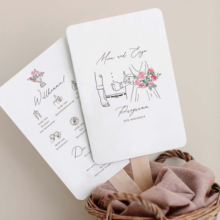 Gestalten Sie die Hochzeitsfächer mit dem Programmablauf Ihrer Feier, um Ihre Gäste auf dem Laufenden zu halten. Der Programmfächer informiert Ihre Gäste über die einzelnen Programmpunkte und sorgt für einen reibungslosen Ablauf Ihrer Hochzeitsfeier. Zudem können sich Ihre Gäste an heißen Tagen mit dem Fächer etwas frische Luft zufächeln.