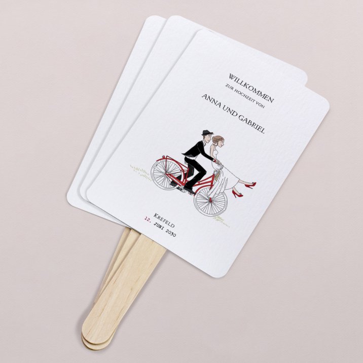 Gestalten Sie die Hochzeitsfächer mit dem Programmablauf Ihrer Feier, um Ihre Gäste auf dem Laufenden zu halten. Der Programmfächer informiert Ihre Gäste über die einzelnen Programmpunkte und sorgt für einen reibungslosen Ablauf Ihrer Hochzeitsfeier. Zudem können sich Ihre Gäste an heißen Tagen mit dem Fächer etwas frische Luft zufächeln.