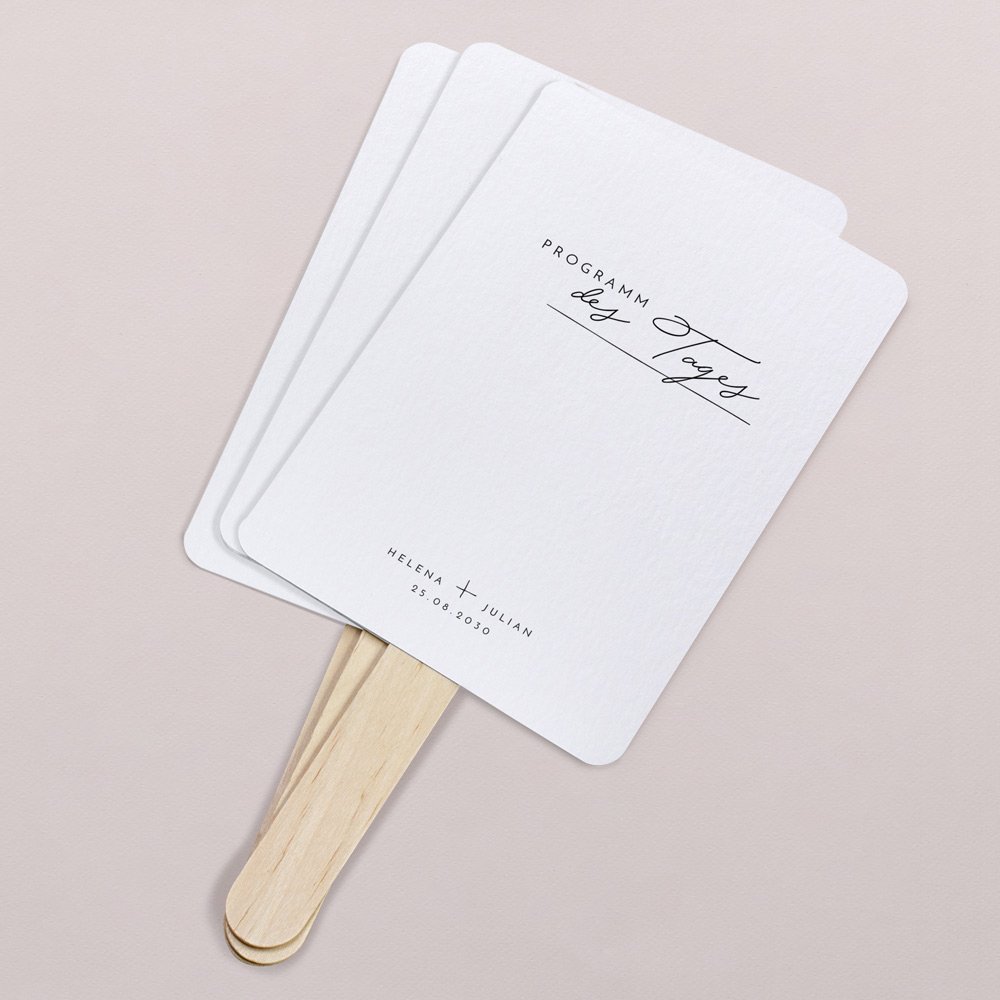 Gestalten Sie die Hochzeitsfächer mit dem Programmablauf Ihrer Feier, um Ihre Gäste auf dem Laufenden zu halten. Der Programmfächer informiert Ihre Gäste über die einzelnen Programmpunkte und sorgt für einen reibungslosen Ablauf Ihrer Hochzeitsfeier. Zudem können sich Ihre Gäste an heißen Tagen mit dem Fächer etwas frische Luft zufächeln.