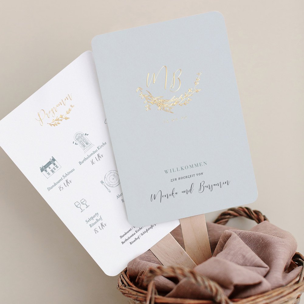 Gestalten Sie die Hochzeitsfächer mit dem Programmablauf Ihrer Feier, um Ihre Gäste auf dem Laufenden zu halten. Der Programmfächer informiert Ihre Gäste über die einzelnen Programmpunkte und sorgt für einen reibungslosen Ablauf Ihrer Hochzeitsfeier. Zudem können sich Ihre Gäste an heißen Tagen mit dem Fächer etwas frische Luft zufächeln.