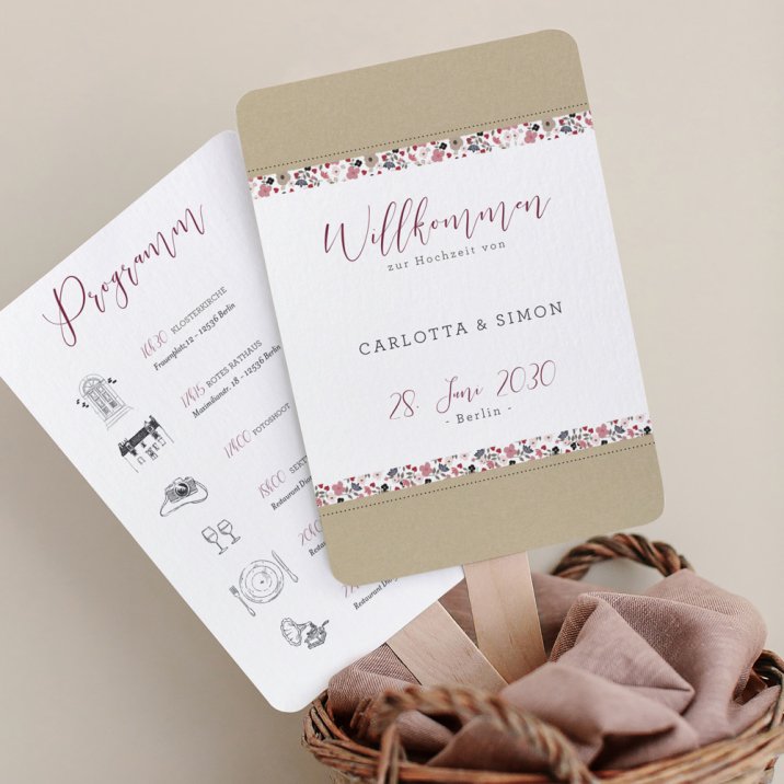 Gestalten Sie die Hochzeitsfächer mit dem Programmablauf Ihrer Feier, um Ihre Gäste auf dem Laufenden zu halten. Der Programmfächer informiert Ihre Gäste über die einzelnen Programmpunkte und sorgt für einen reibungslosen Ablauf Ihrer Hochzeitsfeier. Zudem können sich Ihre Gäste an heißen Tagen mit dem Fächer etwas frische Luft zufächeln.
