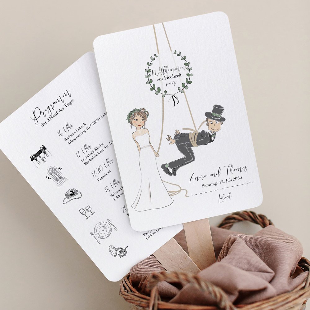 Gestalten Sie die Hochzeitsfächer mit dem Programmablauf Ihrer Feier, um Ihre Gäste auf dem Laufenden zu halten. Der Programmfächer informiert Ihre Gäste über die einzelnen Programmpunkte und sorgt für einen reibungslosen Ablauf Ihrer Hochzeitsfeier. Zudem können sich Ihre Gäste an heißen Tagen mit dem Fächer etwas frische Luft zufächeln.